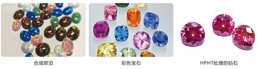 合成,人造,优化及处理宝石标本套装包含:常见合成方法(焰熔法、助熔剂法、水热法、高温高压法HPHT以及化学气相沉淀法CVD等)制备的宝石、常见处理方式(覆膜、压制、拼合、浸蜡、染色、充填等)方式处理的宝石、HPHT改色处理、激光打孔的钻石样品等。